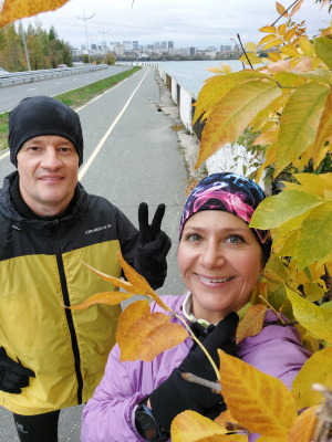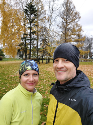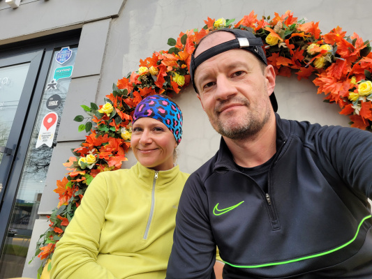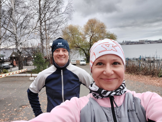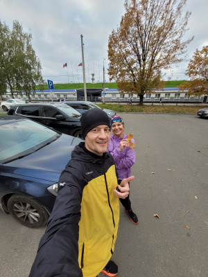 5 ВЕРСТ. 46 забег. Бежалось сегодня тяжело, поэтому решил не выжимать. Догнал жену и бежали вместе практически всю дистанцию. Толком не размялся перед забегом, пришли осенние холода, город два дня был в густом тумане, влажность повышенная. В таких условиях нужна разогревающая, качественная разминка не только для мышц, но и для сердечно-сосудистой системы. Для меня это пробежка в спокойном темпе км 3-4, и короткие ускорения) В противном случае, организм долго включается, сопротивляется.